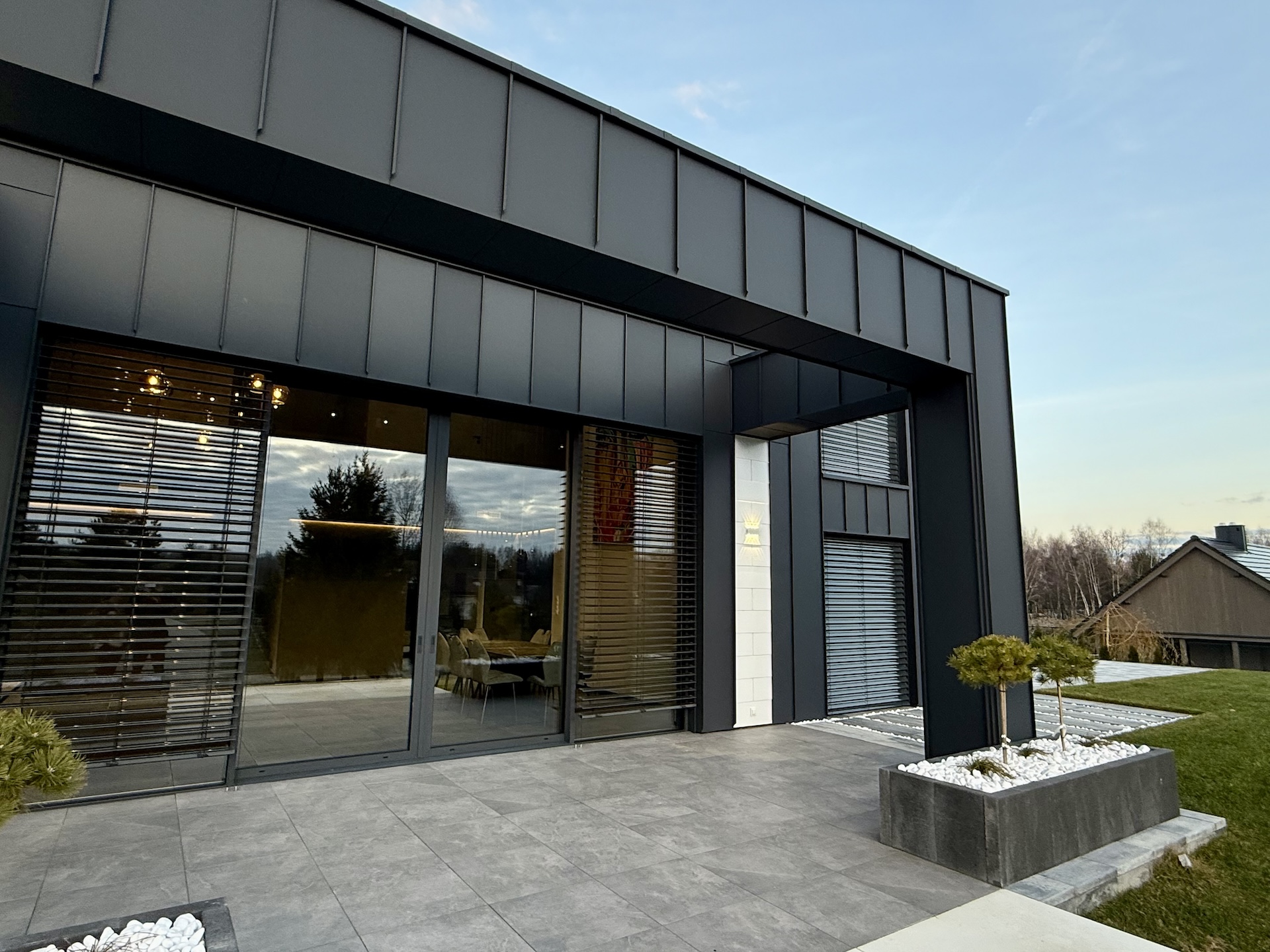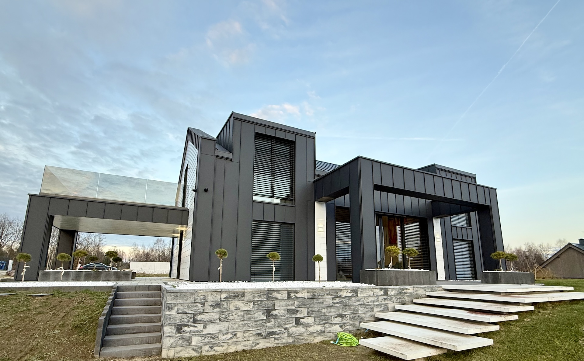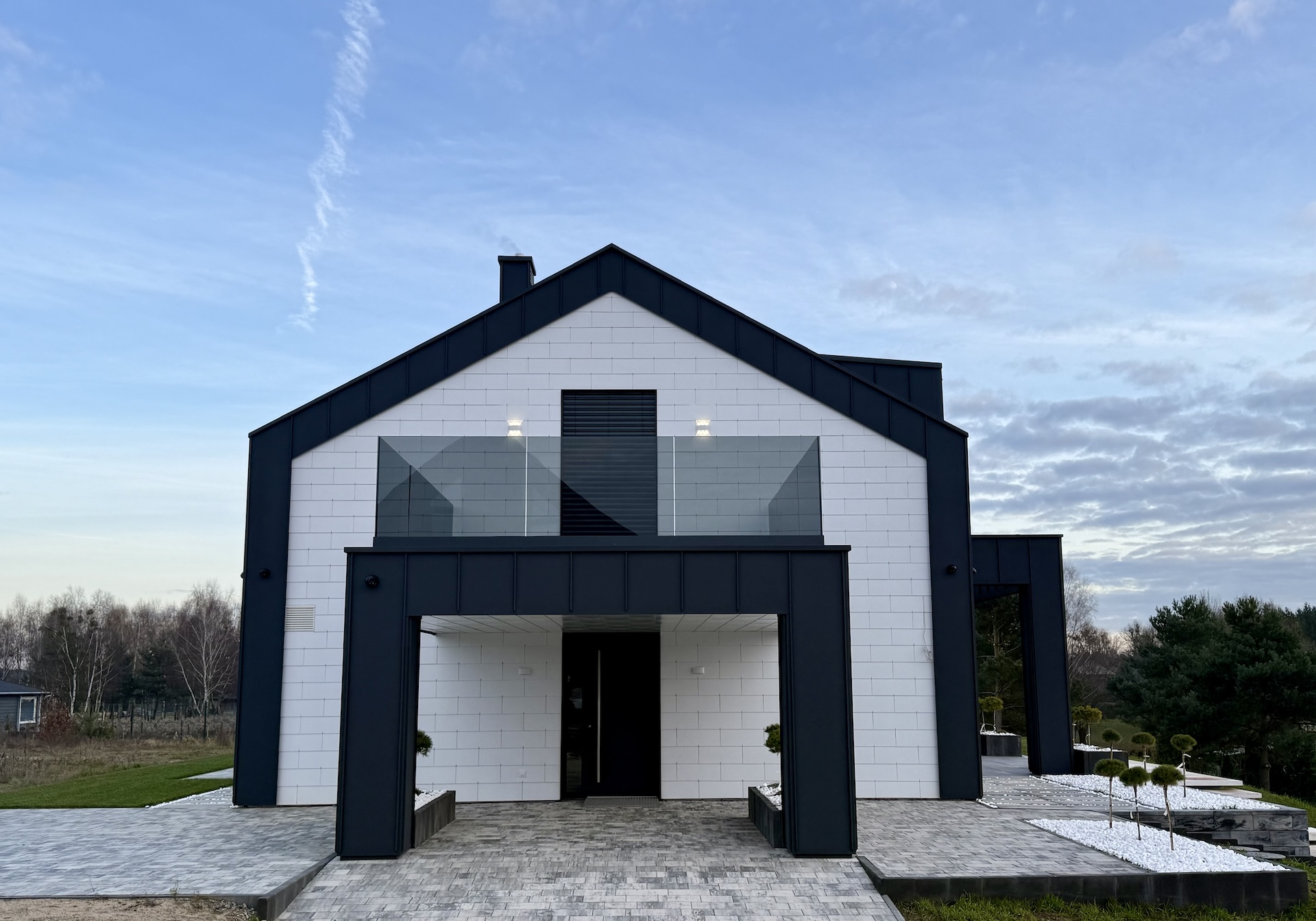 Podjazd prowadzący pod sam dom, zadbana zieleń oraz nowoczesne otoczenie sprawiają, że posesja prezentuje się imponująco zarówno za dnia, jak i wieczorem.