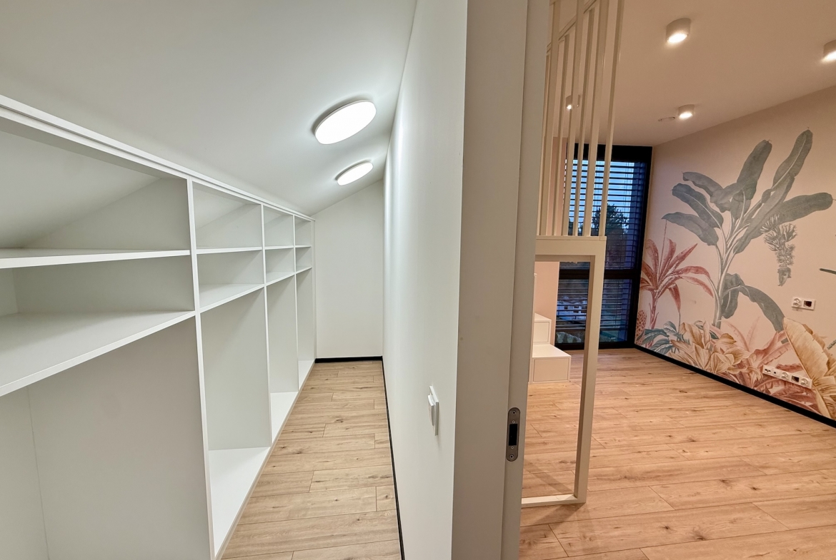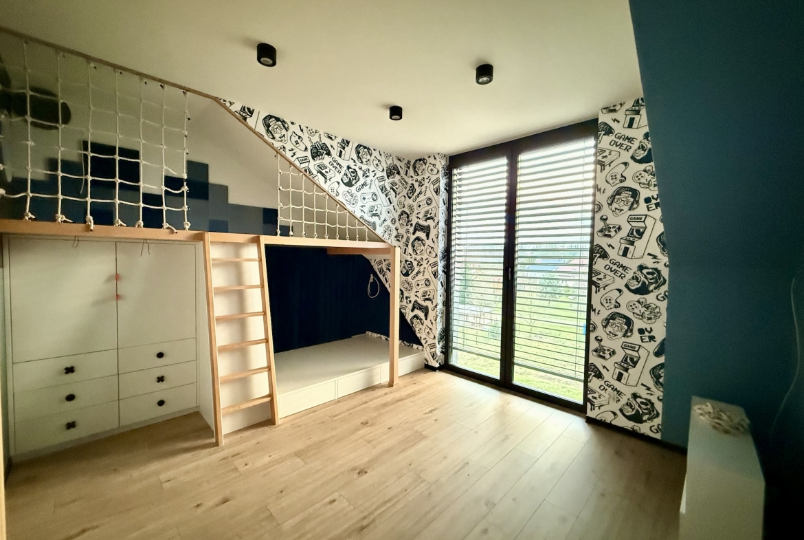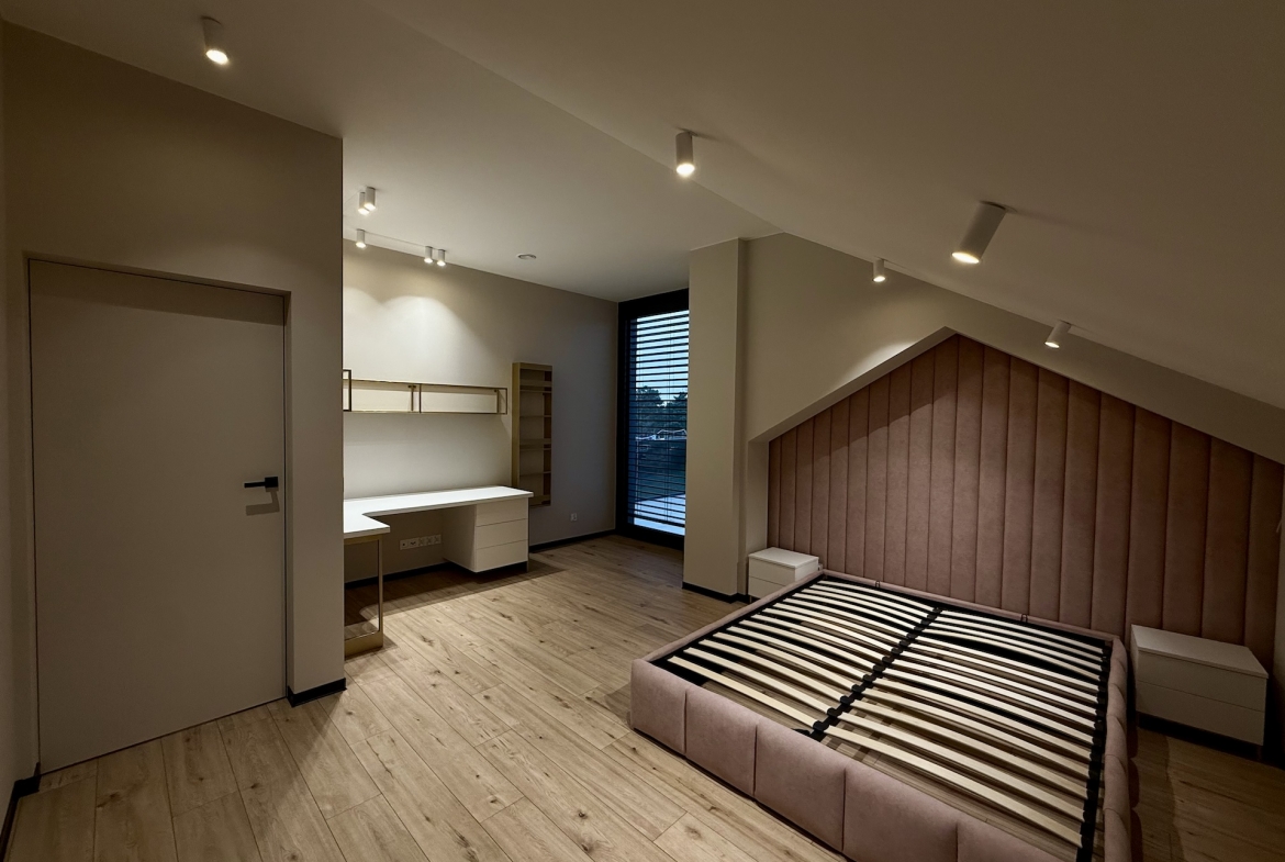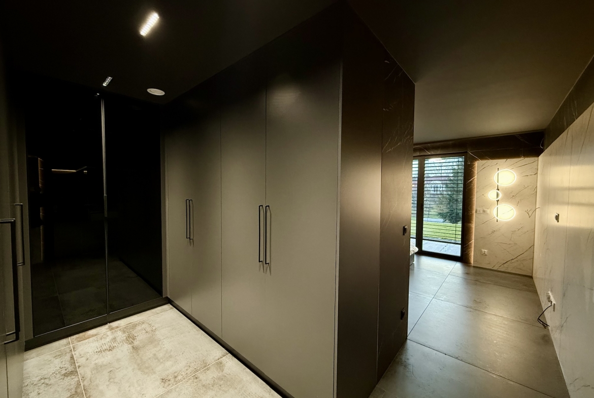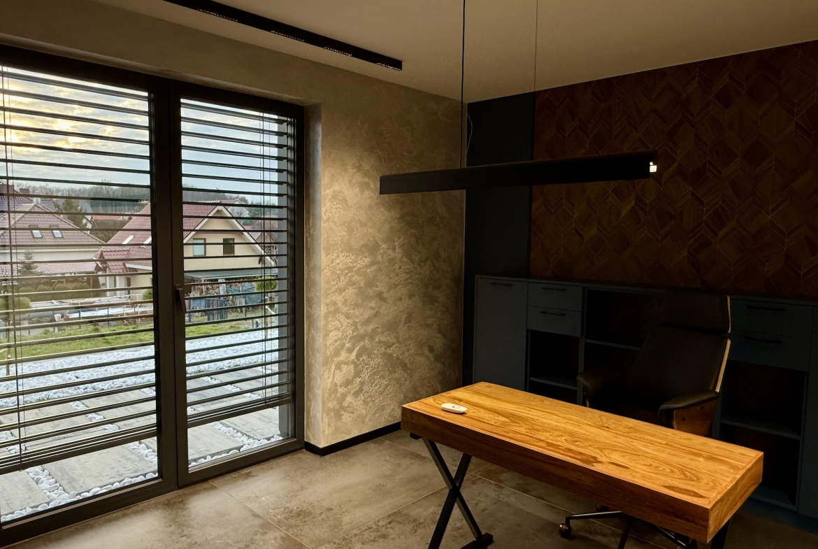 W domu dominują panele oraz płytki premium, a oświetlenie zaprojektowano zgodnie z najnowszymi trendami – funkcjonalnie, elegancko i z dbałością o każdy detal. Dodatkowym udogodnieniem są rolety sterowane pilotem, podkreślające nowoczesny standard nieruchomości.