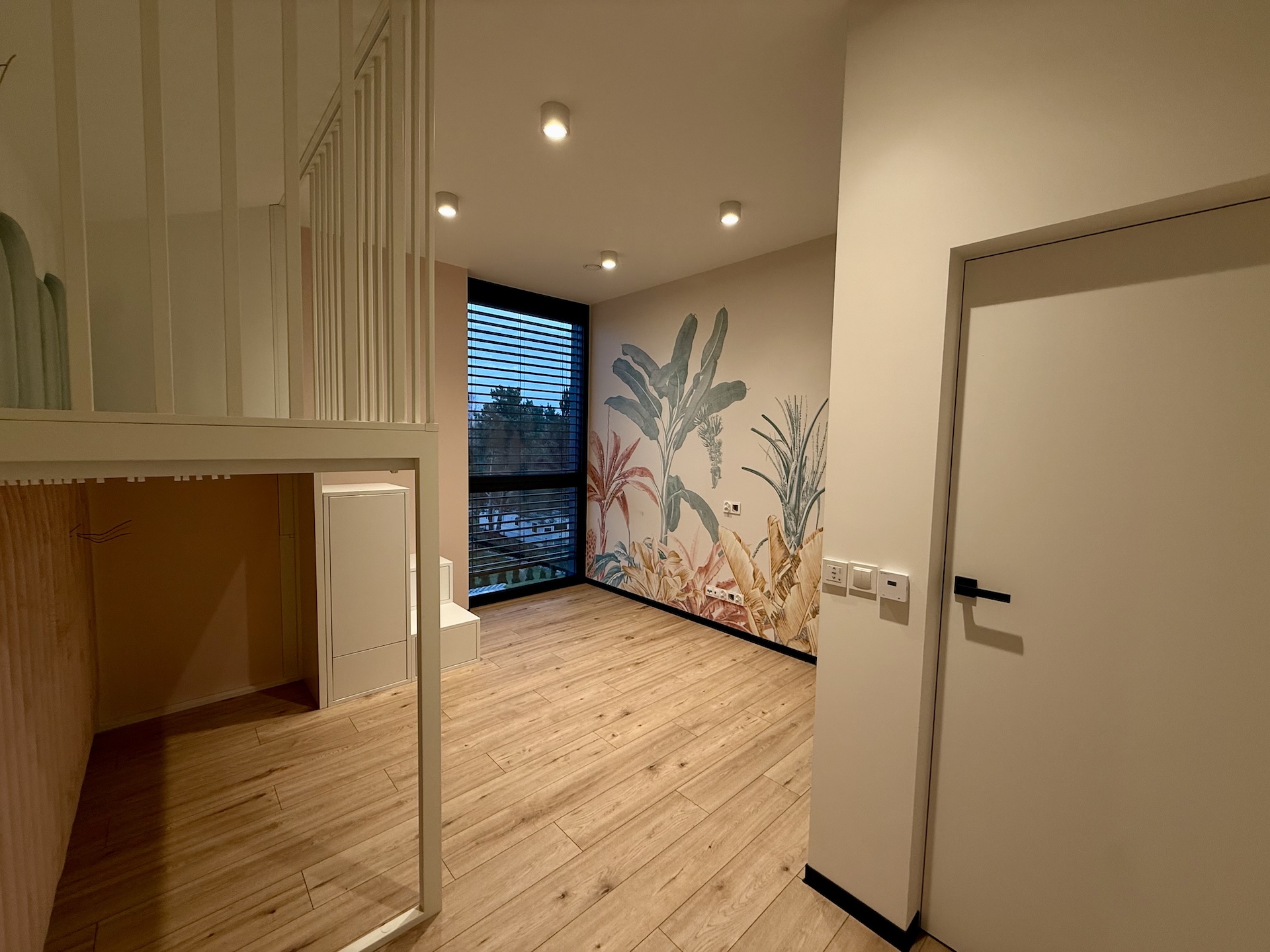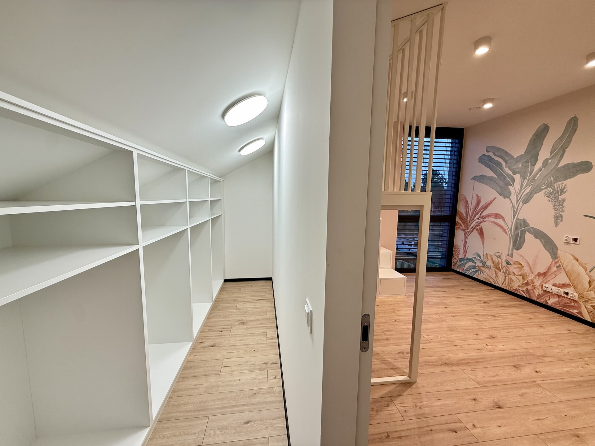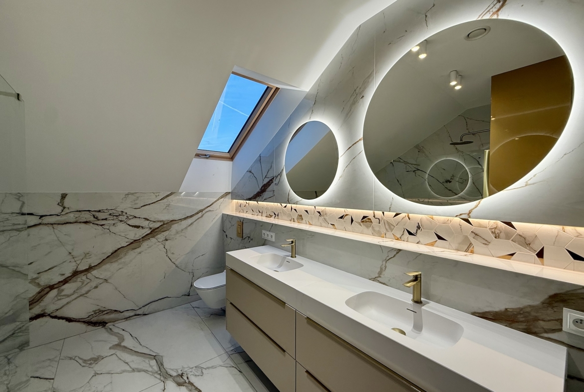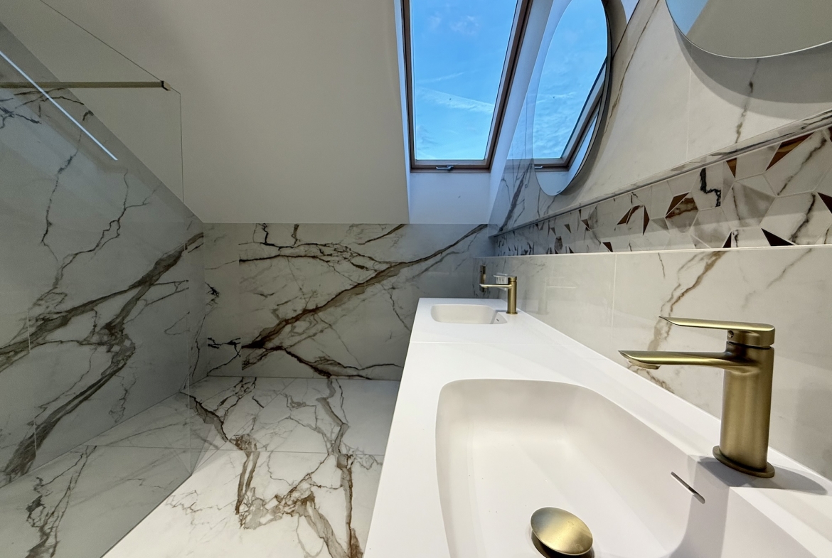 W domu dominują panele oraz płytki premium, a oświetlenie zaprojektowano zgodnie z najnowszymi trendami – funkcjonalnie, elegancko i z dbałością o każdy detal. Dodatkowym udogodnieniem są rolety sterowane pilotem, podkreślające nowoczesny standard nieruchomości.