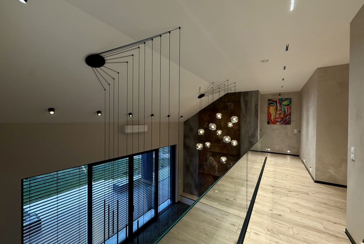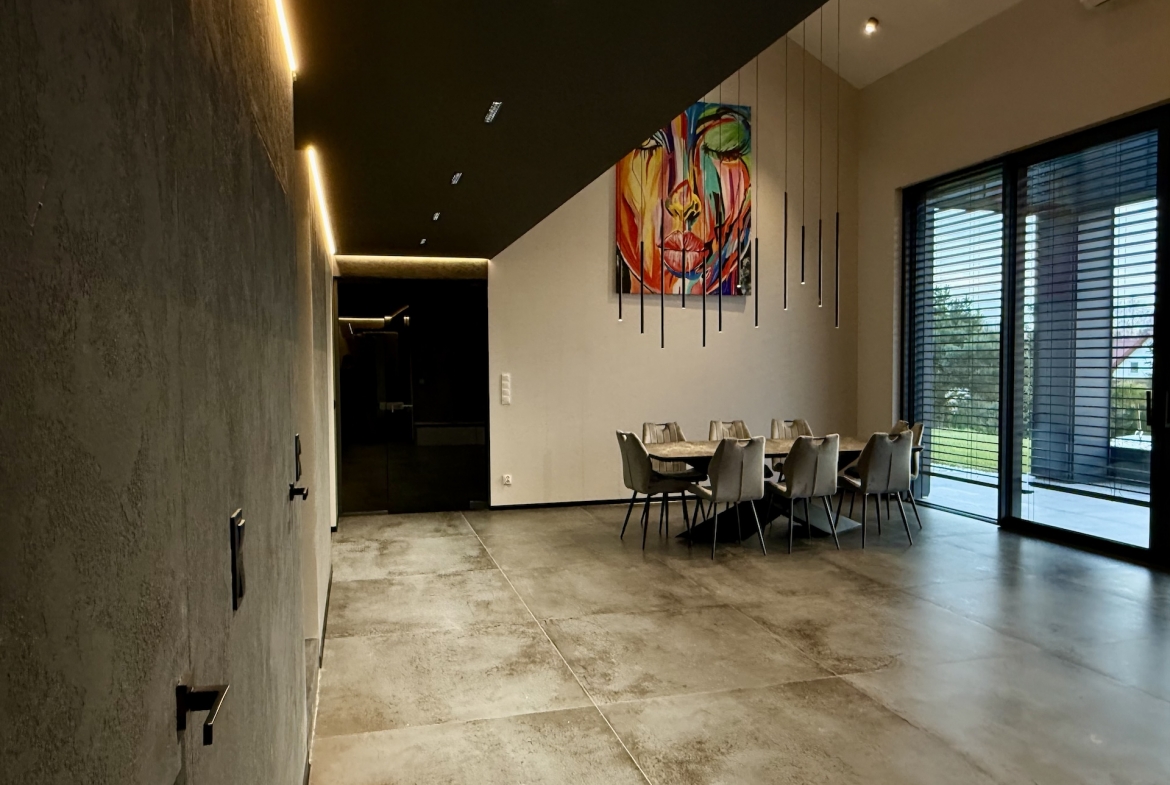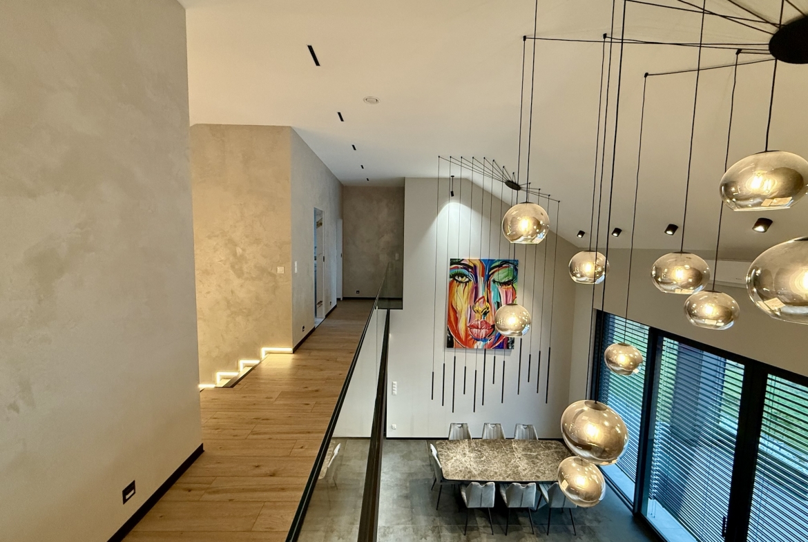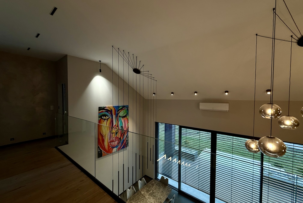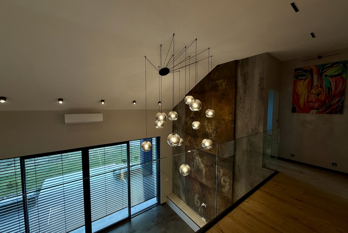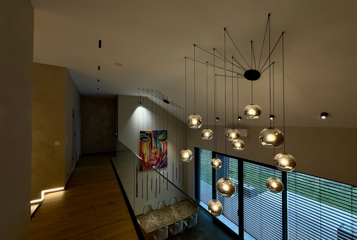 Już od progu czuć, że wnętrza wykonano w standardzie premium. Duże aluminiowe okna wprowadzają ogrom naturalnego światła i idealnie łączą wnętrze z otaczającą przyrodą. W salonie zastosowano wyjątkową konstrukcję – przestrzeń jest otwarta na pełną wysokość domu, co nadaje jej niezwykłej lekkości oraz prestiżowego charakteru. Na górze znajduje się korytarz z widokiem na cały dół, co tworzy efekt przestrzeni znany z najbardziej luksusowych rezydencji.