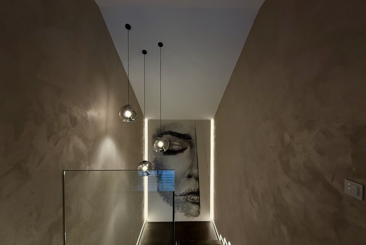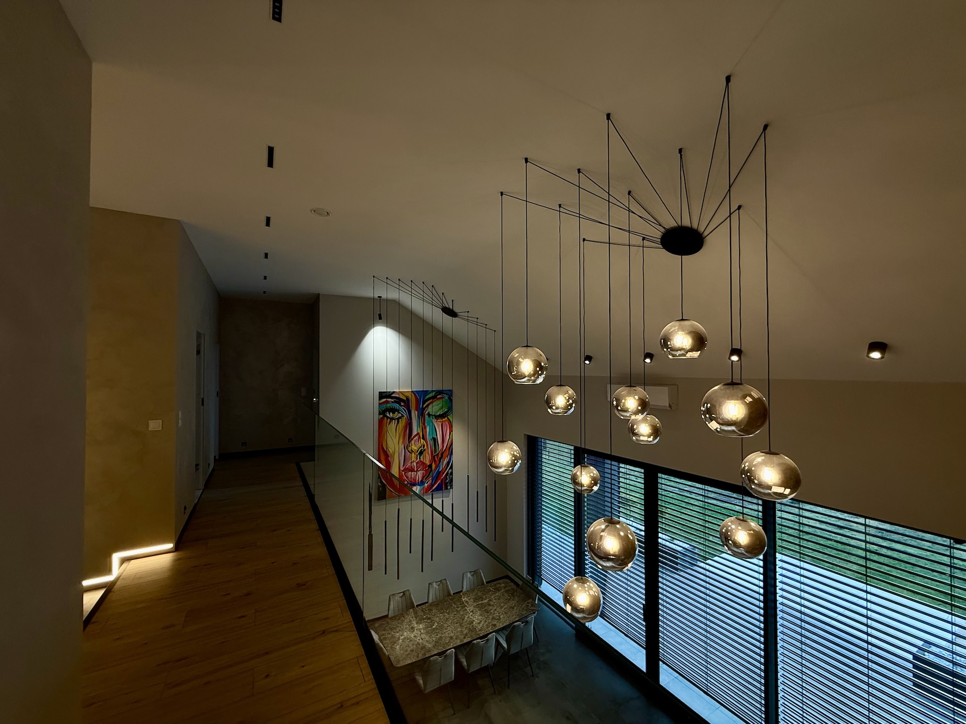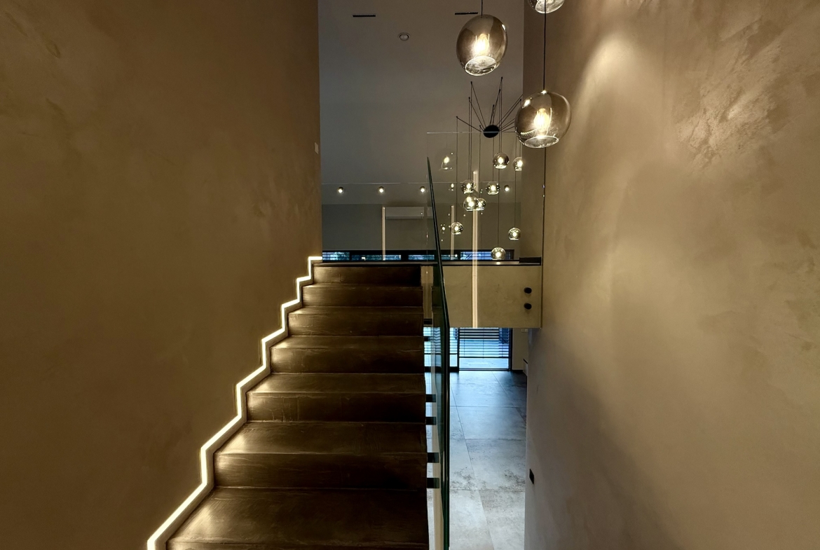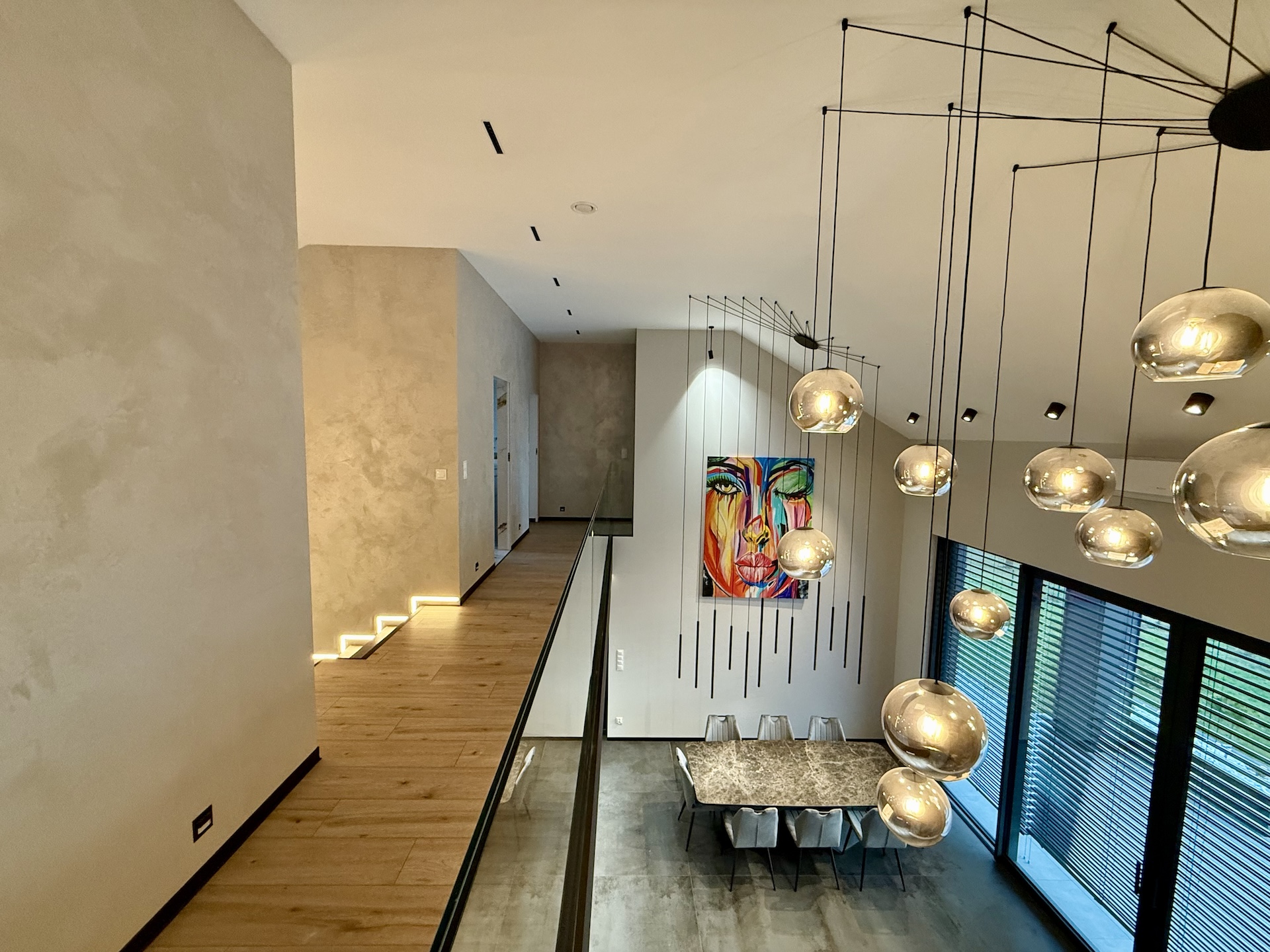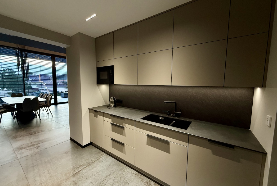 Już od progu czuć, że wnętrza wykonano w standardzie premium. Duże aluminiowe okna wprowadzają ogrom naturalnego światła i idealnie łączą wnętrze z otaczającą przyrodą. W salonie zastosowano wyjątkową konstrukcję – przestrzeń jest otwarta na pełną wysokość domu, co nadaje jej niezwykłej lekkości oraz prestiżowego charakteru. Na górze znajduje się korytarz z widokiem na cały dół, co tworzy efekt przestrzeni znany z najbardziej luksusowych rezydencji.