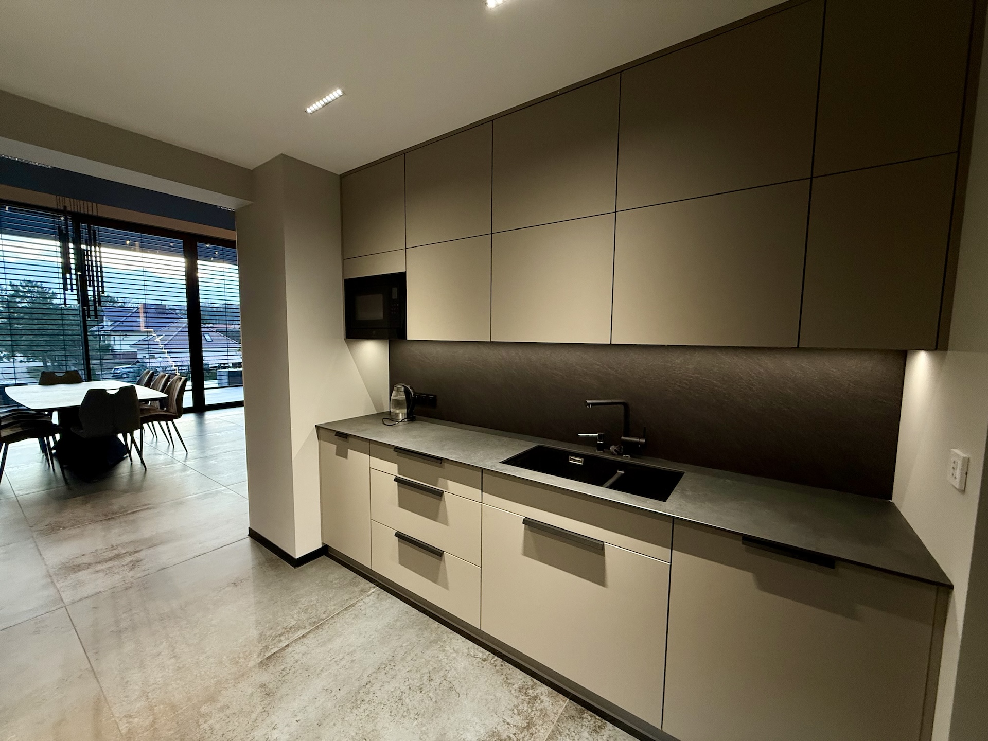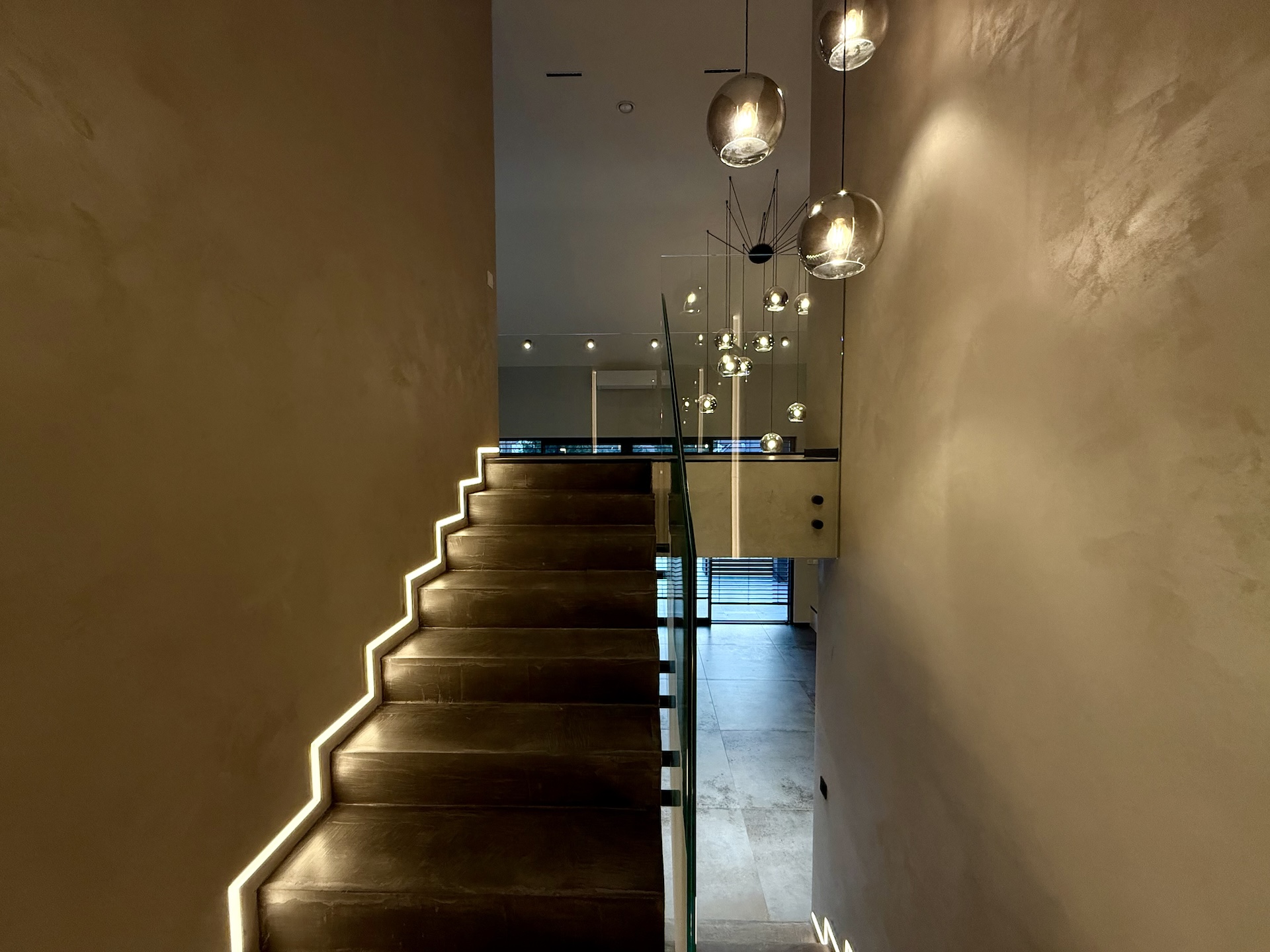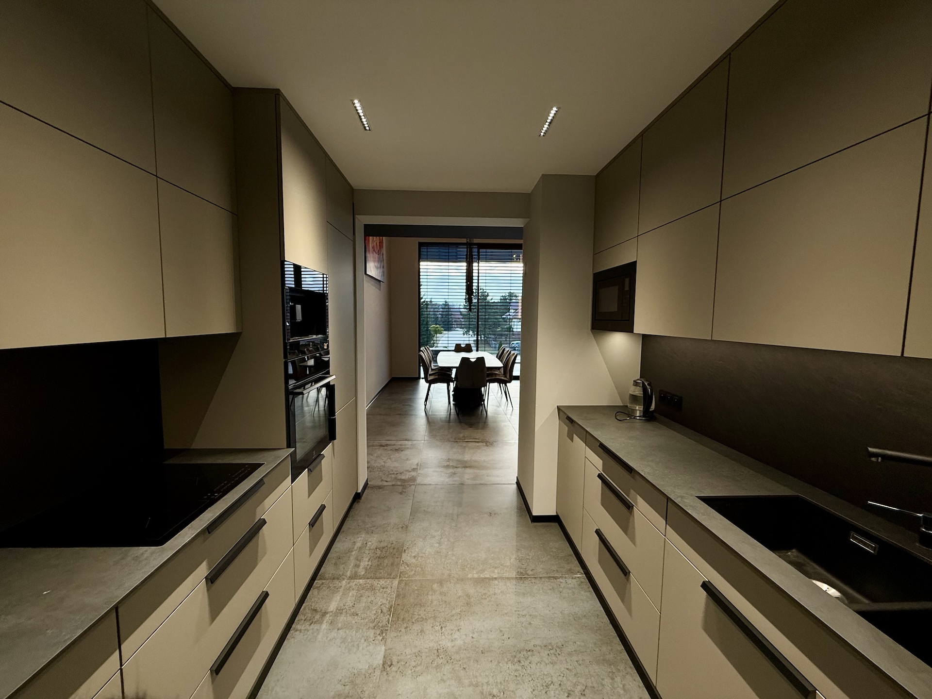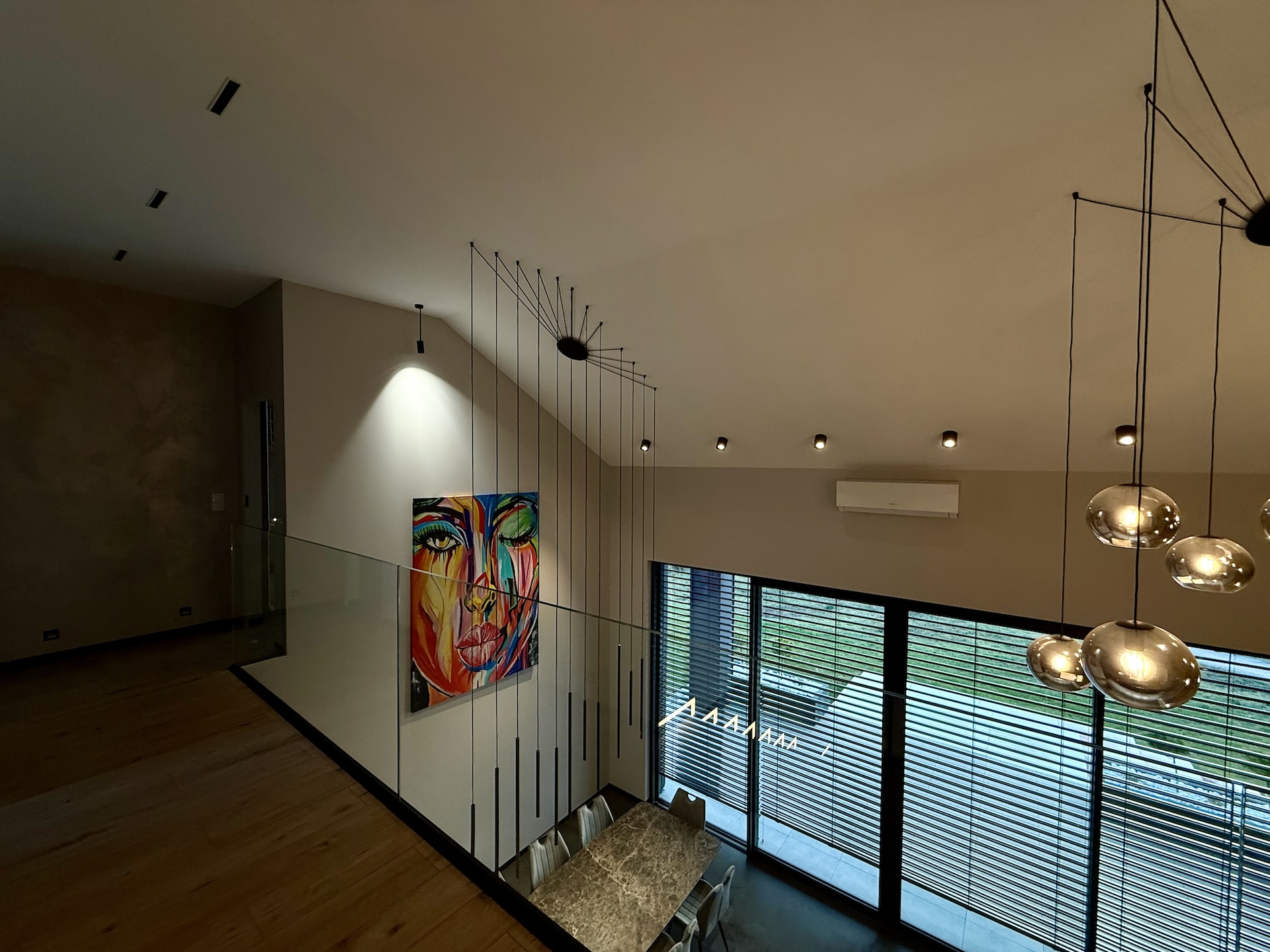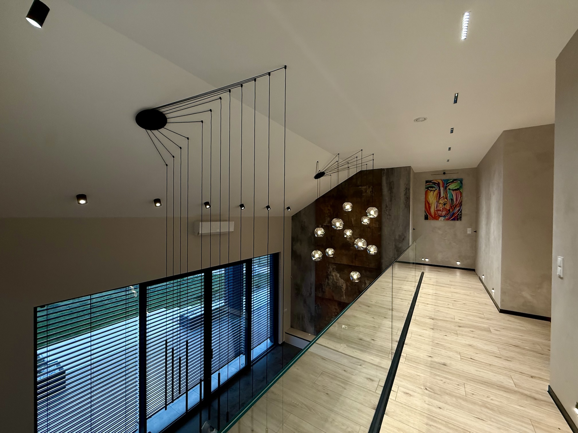 Już od progu czuć, że wnętrza wykonano w standardzie premium. Duże aluminiowe okna wprowadzają ogrom naturalnego światła i idealnie łączą wnętrze z otaczającą przyrodą. W salonie zastosowano wyjątkową konstrukcję – przestrzeń jest otwarta na pełną wysokość domu, co nadaje jej niezwykłej lekkości oraz prestiżowego charakteru. Na górze znajduje się korytarz z widokiem na cały dół, co tworzy efekt przestrzeni znany z najbardziej luksusowych rezydencji.