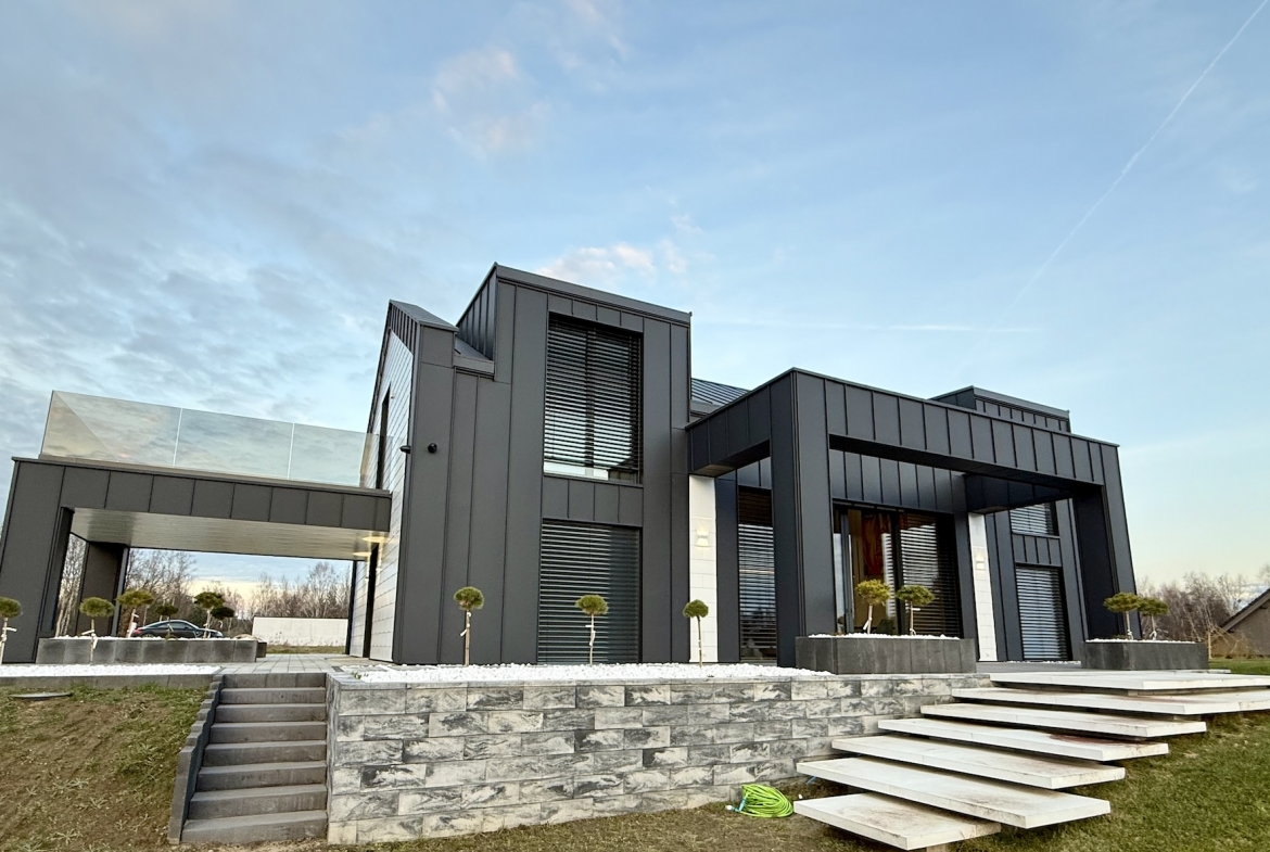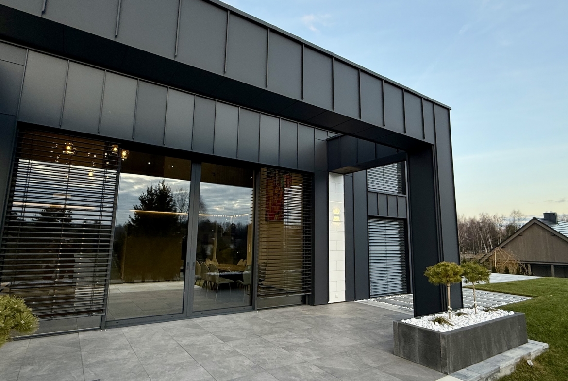 Dom w Łagowie został wybudowany w 2025 roku i reprezentuje najwyższą jakość architektury współczesnej. Elewacja wykonana z blachy oraz struktonitu, zestawiona z idealnie dobranymi elementami drewnianymi, nadaje budynkowi wyjątkowego, prestiżowego charakteru. Jego energooszczędność to zasługa nowoczesnego ocieplenia wykonanego z płyty PIV i suszonych łat drewnianych, co przekłada się na minimalne koszty utrzymania.