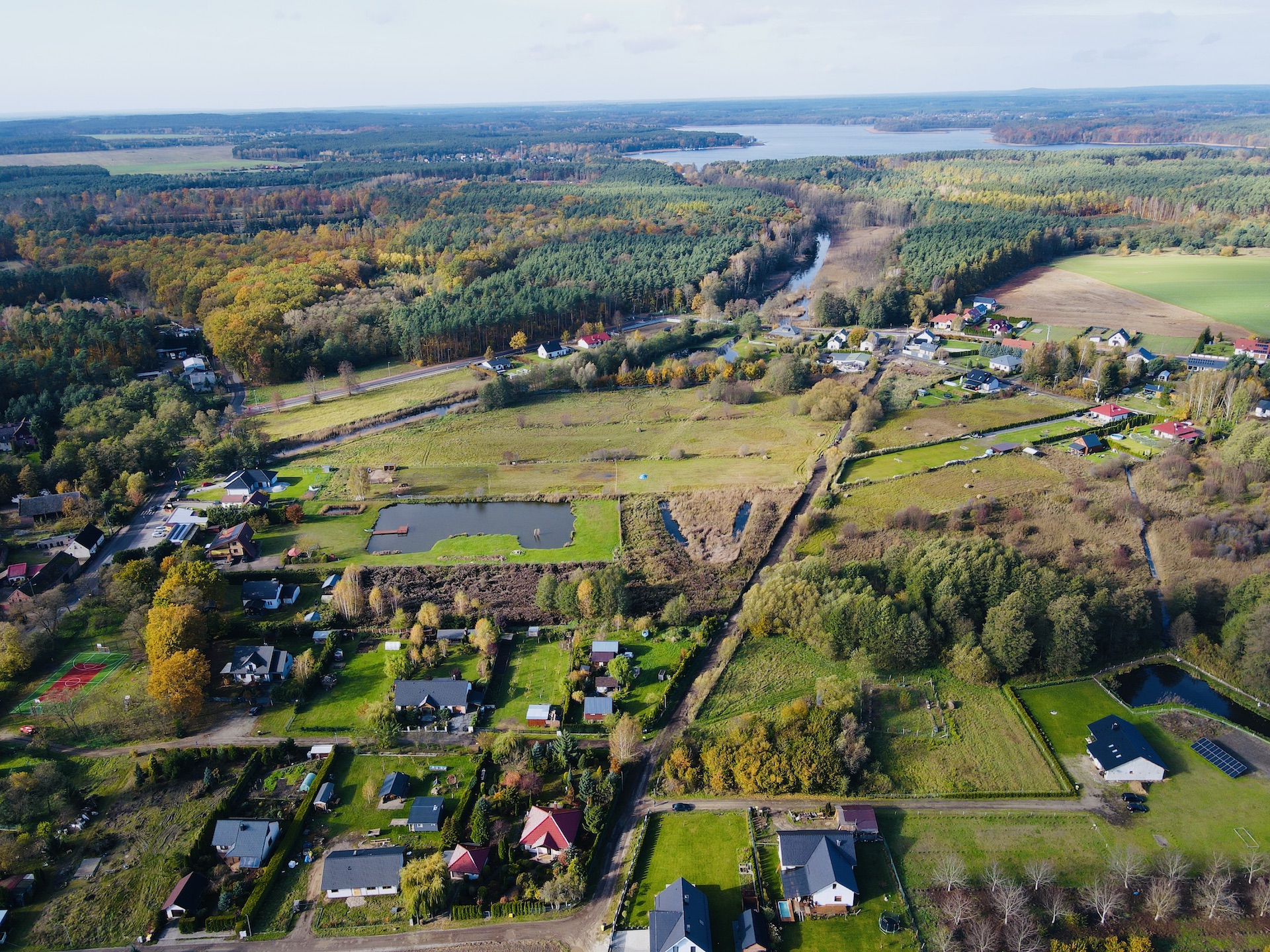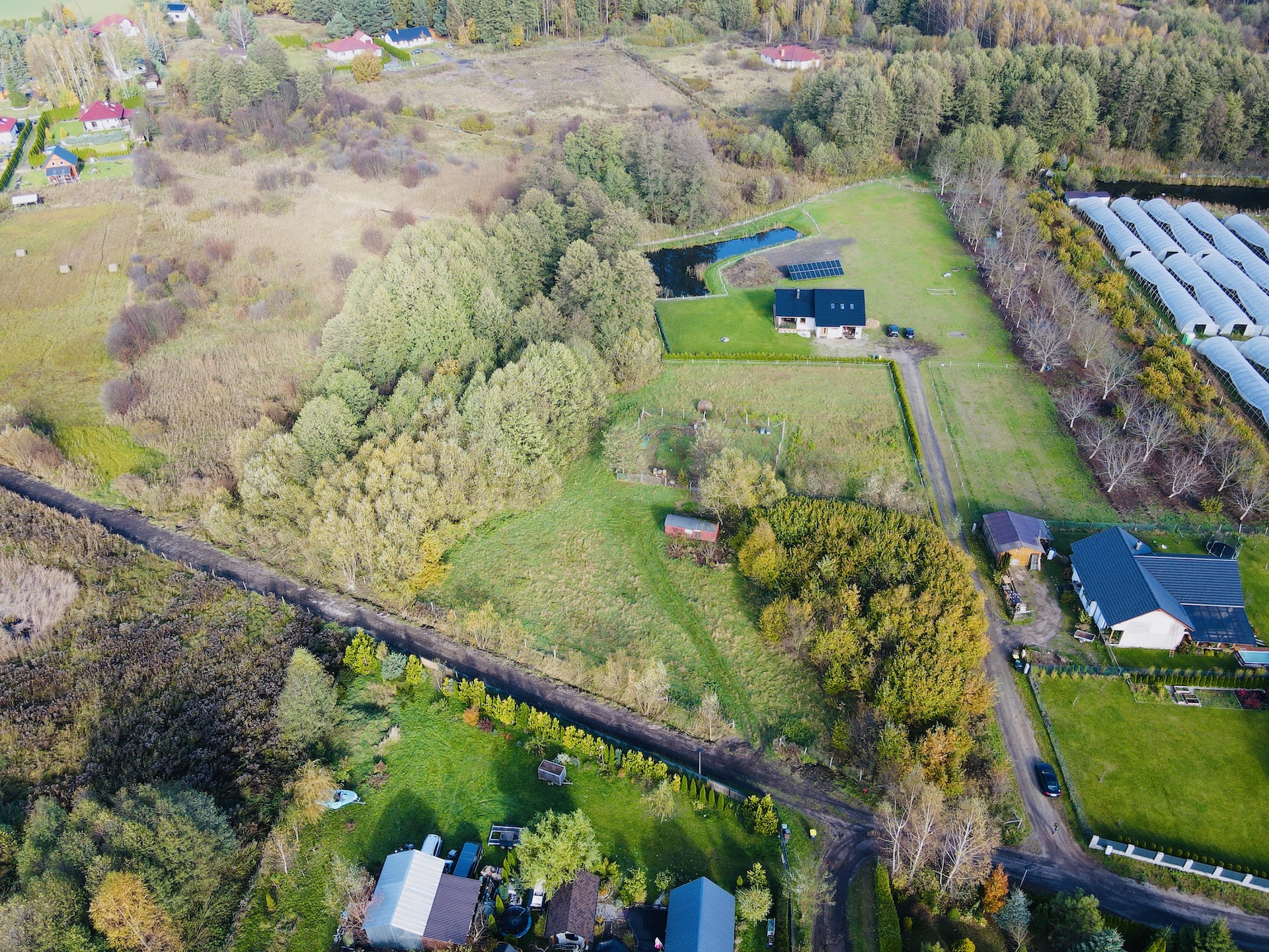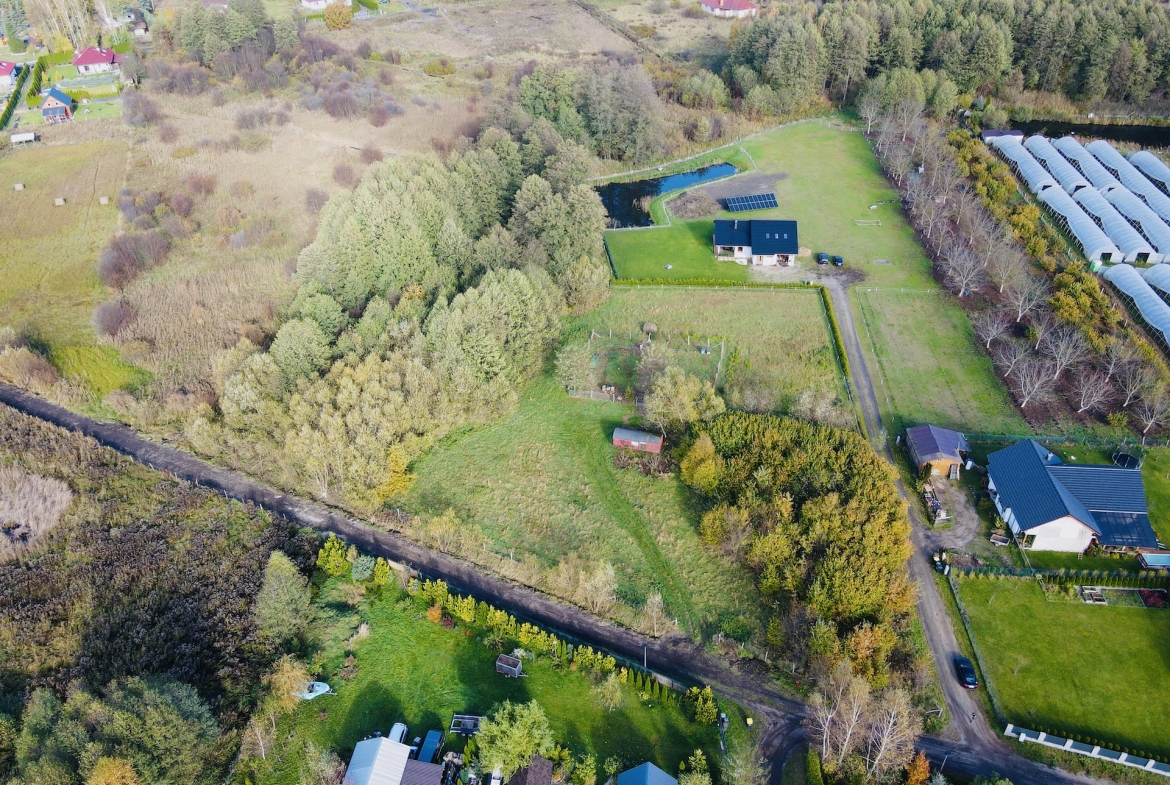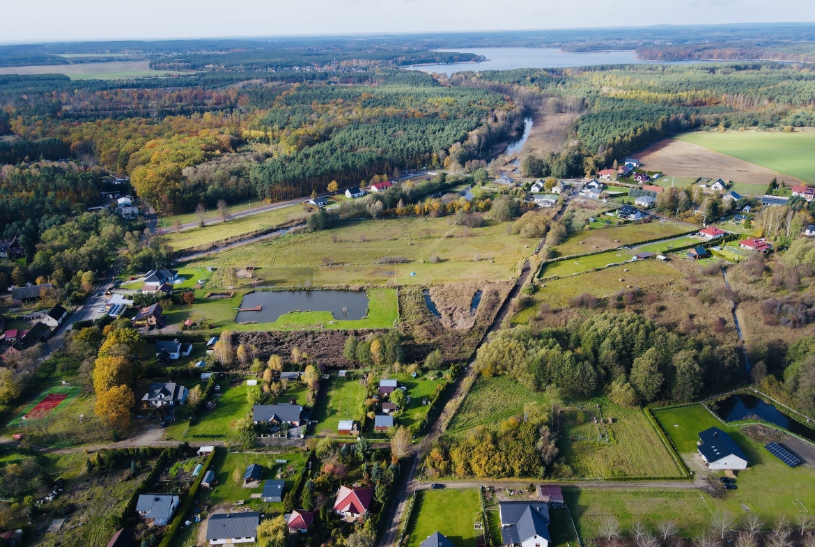 Otoczenie to malownicze lasy, pola i pojedyncze zabudowania, idealna przestrzeń dla osób, które marzą o własnym kawałku ziemi w spokojnym, zielonym miejscu. W sąsiedztwie znajdują się domy jednorodzinne, a dojazd do Świebodzina zajmuje zaledwie kilka minut.